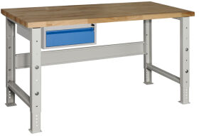 Výškově stavitelný dílenský stůl s 1-zásuvkovým uzamykatelným kontejnerem. Zásuvka na teleskopických kuličkových výsuvech, výsuv 100%, nosnost 50 kg. Podélná zadní výztuha d x v = 1920 x 140 mm pro zvýšení tuhosti a stability stolu. Rozměry stolu d x š x v = 2000 x 700 x 700 - 1070 mm, - max. zdvih 370 mm, nastavení v kroku 25 mm. Rozměry kontejneru v x š x h = 225 x 461 x 600 mm, výška zásuvky 180 mm. Nosnost stolu 500 kg při rovnoměrně rozloženém zatížení. Podnoží je svařeno z ocelových profilů tl. 2,2 mm, výškové nastavení pomocí 2 x 2 ks šroubů M10. Pracovní plocha z kvalitní bukové spárovky tl. 40 mm (bez povrchové úpravy) anebo z bukové překližky tl. 40 mm, (horní plocha ošetřena lněnou fermeží) - požadovanou variantu pracovní desky vyberte v možnostech produktu. Všechny horní hrany jsou zaobleny (r = 3 mm). Povrchová úprava práškovým lakem, barva šedé/modrá RAL 7035. Stůl se dodává rozložený, možnost ukotvení stolu k podlaze, montážní materiál přiložen. Záruka na jakost 5 let.
