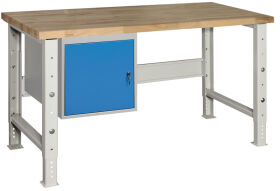 Výškově stavitelný dílenský stůl se závěsnou skříňkou. Podélná zadní výztuha pro zvýšení tuhosti a stability stolu. Rozměry d x š x v = 1200 x 700 x 700 - 1070 mm (výška uvedena vč. spárovky tl. 40 mm). Rozměry kontejneru v x š x h = 530 x 461 x 600 mm, výbava - 1 pozinkovaná police. Nosnost stolu 500 kg při rovnoměrně rozloženém zatížení. Podnoží je svařeno z ocelových profilů tl. 2,2 mm, výškové nastavení pomocí 2 x 2 ks šroubů M10. Pracovní plocha z kvalitní bukové spárovky tl. 40 mm, rozměry 1200 x 700 mm. Všechny horní hrany jsou zaobleny (r = 3 mm). Povrchová úprava práškovým lakem, barva šedá/modrá RAL 7035/5015. Stůl se dodává rozložený, otvory pro vruty nutno předvrtat. Možnost ukotvení stolu k podlaze, montážní materiál přiložen. Záruka na jakost 5 let.
