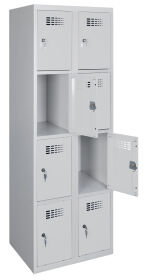 Svařovaná šatní skříň s 8-mi uzamykatelnými boxy pro osobní věci zaměstnanců. Vnější rozměry skříně 1800 x 600 500 mm, výška soklu 40 mm. Vnitřní rozměry boxu v x š x h = 435 x 300 x 480 mm, vstupní otvor boxu v x š = 410 x 220 mm. Celkový počet sloupců/dveří = 2/8. Rám korpusu i boční lemy dvířek zesíleny uzavřeným profilem, což významně zvyšuje tuhost a odolnost proti násilnému vniknutí. Výbava - plastový štítek pro jmenovku na dveřích. Uzamykání dveří bezpečnostními cylindrickými zámky se 2 klíči, lze objednat generální klíč - cena 350,- Kč/ks. Přídavná výztuha u všech dveří pod cyl. zámkem proti jeho násilnému vytržení či přetočení - tl. plechu výztuhy 1,1 mm. Na bocích skříně připraveny otvory pro spojování více skříní do 1 celku (sešroubováním). Povrchová úprava práškovým vypalovaným lakem, barva korpus/dveře šedá/modrá RAL 7035/5012. Záruka na jakost 3 roky.