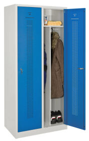 Svařovaný 2-dveřový šatník na soklu s perforovanými dveřmi. Velmi kvalitně zpracovaná, tuhá konstrukce. Celkové vnější rozměry v x š x h = 1800 x 800 x 500 mm, šířka každého oddílu = 400 mm, výška soklu 80 mm. Tloušťka plechu - korpus 0,6 mm, dvířka 0,7 mm. Svislá vnitřní přepážka v každém oddíle odděluje prostor pro uložení pracovního a civilního oděvu. Úprava rámu zabraňuje násilné zatlačení dveří dovnitř skříně. Zámek cylindrický se 2 klíči. Výbava oddílu - polička, tyč na ramínka se 2 plastovými háčky, mezistěna, větrací otvory, na dveřích jmenovka. Povrchová úprava práškovým lakem, barva šedá/modrá RAL 7035/5015. Záruka na jakost 3 roky.