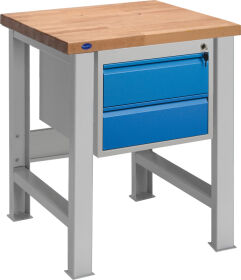 Dílenský stůl s 2-zásuvkovým kontejnerem. Rozměry stolu d x š x v = 750 x 700 x 840 mm. Kvalitní teleskopické výsuvy zásuvek - 100% výsuv. Nosnost zásuvek 50 kg. Výška zásuvek 2 x 150 mm, zásuvky vybaveny 1 příčným kovovým děličem. Rozměry kontejneru v x š x h = 377 x 461 x 600 mm. Nosnost stolu 500 kg při rovnoměrném zatížení. Pracovní plocha z kvalitní bukové spárovky tl. 40 mm (bez povrchové úpravy). Všechny horní hrany jsou zaobleny (r = 3 mm). Podnoží svařeno z ocelových profilů tl. 3 mm. Povrchová úprava podnoží vypalovaným práškovým lakem, šedá RAL 7035. Stůl se dodává rozložený, možnost ukotvení stolu k podlaze. Montážní materiál přiložen. Hmotnost stolu 56 kg. Záruka na jakost 5 let.