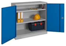 Robustní svařovaná skříň ideální pro použití ve všech průmyslových provozech. Svařovaný korpus skříně z ocel. plechu tl. 0,9 - 1 mm, nosnost korpusu 1000 kg. Vnější rozměry v x š x h = 1000 x 1000 x 450 mm. 2 ks polic, nosnost 100 kg na polici (rovnoměrně rozložené zatížení). Přestavitelné police v rastru 25 mm. Vyztužené dveře se skrytými závěsy, uzamykání cylindrickým zámkem (2 klíče) + 2-bodovým rozvorovým mechanismem. Práškový epoxidový lak se zvýšenou odolností vůči oděru, barva šedá/modrá RAL 7035/5015. Záruka na jakost 3 roky.