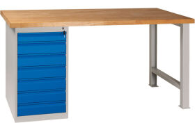 Dílenský stůl se 7-mi zásuvkovým kontejnerem. Rozměry stolu d x š x v = 1500 x 700 x 840 mm. Kvalitní teleskopické výsuvy zásuvek - 100%. Nosnost zásuvek 50 kg, výška zásuvek 1 x 73 mm, 6 x 98 mm. Zásuvky v=98 mm se dodávají včetně příčného přestavitelného kovového děliče (1ks /1 zásuvka). Rozměry kontejneru v x š x h = 800 x 461 x 600 mm. Centrální bezpečnostní zámek, 2 klíče (1 ks s kloubem pro ochranu proti zalomení). Nosnost stolu 500 kg při rovnoměrném zatížení, podnoží svařeno z ocelových profilů tl. 3 mm. Rozměr podnoží d x š x v = 660 x 70/140 x 800 mm. Pracovní plocha z kvalitní bukové spárovky tl. 40 mm (bez povrchové úpravy) anebo z bukové překližky tl. 40 mm, (horní plocha ošetřena lněnou fermeží) - požadovanou variantu pracovní desky vyberte v možnostech produktu. Všechny horní hrany jsou zaobleny (r = 3 mm). Stůl se dodává rozložený, montážní materiál přiložen. Možnost ukotvení stolu k podlaze. Hmotnost stolu 94 kg. Záruka na jakost 5 let.