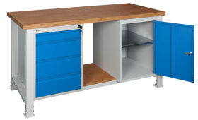 Výbava stolu: kontejner se 4-mi zásuvkami, skříňka s vyjímatelnou policí a spodní police. Rozměry stolu š x h = 1 500 x 700 mm, výška stolu 880 mm (pevné podnoží), nebo 840/880/920 mm (stavitelné podnoží). Rozměry skříňky v x š x h = 662 x 461 x 600 mm. Výbava skříňky - 1 ks police, nosnost 40 kg, otevírání dveří skříňky lze upravit - vlevo anebo vpravo dle potřeby. Rozměry zásuvkového kontejneru: 662 x 461 x 600 mm. Počet a výška zásuvek (vnější/vnitřní): 1 x 82/68 mm, 3 x 166/150 mm. Vnitřní šířka x hloubka zásuvek: 390 x 530 mm. Výbava zásuvek: 1 ks prázdná zásuvka vhodná pro sadu plastových boxů pro organizaci obsahu (viz příslušenství), 3 ks zásuvek včetně příčného přestavitelného kovového děliče. Centrální cylindrický zámek se 2 klíči. 100% teleskopický výsuv zásuvek na kuličkových ložiskách. Nosnost zásuvek 50 kg. Podnoží svařeno z ocelových profilů 60 x 40 mm, tl. 2 mm, výztuhy z profilů 40 x 40 mm, tl. 2 mm. Nosnost stolu 500 kg při rovnoměrném zatížení. Barva podnoží šedá RAL 7035, barva kontejneru šedá/modrá RAL 7035/5015. Možnost ukotvení stolu k podlaze. Pracovní plocha z kvalitní bukové spárovky tl. 40 mm (bez povrchové úpravy), anebo z bukové překližky - multiplex, tl. 40 mm, (horní plocha ošetřena lněnou fermeží) - požadovanou variantu pracovní desky a podnoží vyberte v možnostech produktu. Všechny horní hrany jsou zaobleny (r = 3 mm). Spodní police z bukové překližky tl. 20 mm, š x h = 396 x 490 mm. Záruka na jakost 5 let.