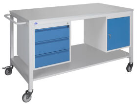 Tuhá a stabilní konstrukce, svařovaný horní rám stolu. Konstrukce z ocelových profilů 40 x 40 mm. Rozměry stolu v x š x h = 900 x 1500 x 800 mm, pracovní deska tl. 25 mm - šedé lamino. Obvodové ABS hrany tl. 2 mm. Kovové madlo pr. 22 mm. 3-zásuvkový kontejner. Kvalitní teleskopické výsuvy zásuvek 100% výsuv, nosnost zásuvek 50 kg, výška zásuvek 3 x 150 mm, všechny zásuvky vybaveny 1 příčným kovovým děličem. Skříňka s 1 přestavitelnou policí, v x š x h = 530 x 461 x 600 mm. Cylindrický zámek se 2 klíči. Povrchová úprava práškovým lakem, barva šedá/modrá RAL 7035/5015. Pojízdná kolečka (nešpinivá) - pr. 100 mm, 2 x otočná kolečka, 2 x otočná s brzdou. Nosnost stolu 300 kg. Záruka na jakost 5 let.