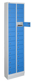 Svařovaná šatní skříň se 30-ti uzamykatelnými miniboxy pro osobní věci zaměstnanců. Vnější rozměry skříně 1800 x 460 x 200 mm, rozměry boxu v x š x h = 111 x 230 x 200 mm, vstupní otvor boxu v x š = 94 x 165 mm. Výška soklu v = 60 mm. Celkový počet sloupců/dveří = 2/30. Skříň je opatřena bezpečnostními cylindrickými zámky se 2 klíči, lze objednat generální klíč - cena 350,- Kč/ks. Příprava pro kotvení skříně ke zdi, spojovací materiál je přiložen. Povrchová úprava práškovým vypalovaným lakem, barva korpus/dveře šedá/modrá RAL 7035/5015. V jiné barvě dvířek lze objednat od min. počtu 10 ks. Záruka na jakost 3 roky. Minimální objednávka 10 ks.