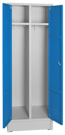 Svařovaný 2-dveřový šatník na soklu. Rozměry v x š x h = 1800 x 600 x 500 mm. 2 samostatné oddíly po 300 mm. Úprava rámu proti vtlačení dveří do skříně, zesílení dveří výztuhami + větrací otvory. Tl. plechu korpus 0,6 mm, dvířka 0, 7 mm. Uzamykaní dveří společné jedním otočným uzávěrem (pro visací zámek) anebo cylindrickým zámkem. Výbava oddílů - pevná horní police, tyč na ramínka se 2 plastovými háčky, prolis na jmenovku. Povrchová úprava epoxidovým práškovým lakem se zvýšenou odolností proti poškrábání, barva šedá/modrá RAL 7035/5015. Záruka na jakost 3 roky.